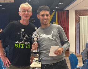 Bildunterschrift: Der Sieger des ersten EAFC-Turniers Aron Shala mit Jugendpfleger Robert Budde