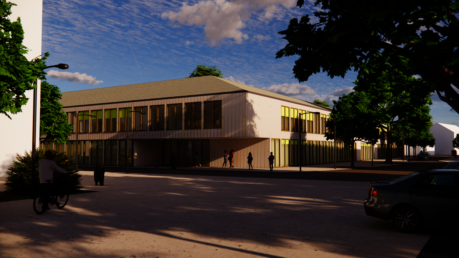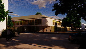 Im Erdgeschoss sind eine Einfach-Sporthalle, eine Bibliothek und ein Jugendtreff vorgesehen. Diese Bereiche lassen sich unabhängig vom Schulbetrieb nutzen, etwa von Vereinen oder Bürgerinnen und Bürgern, und bieten am Nachmittag und Abend Raum für Treffen, Austausch und Veranstaltungen.